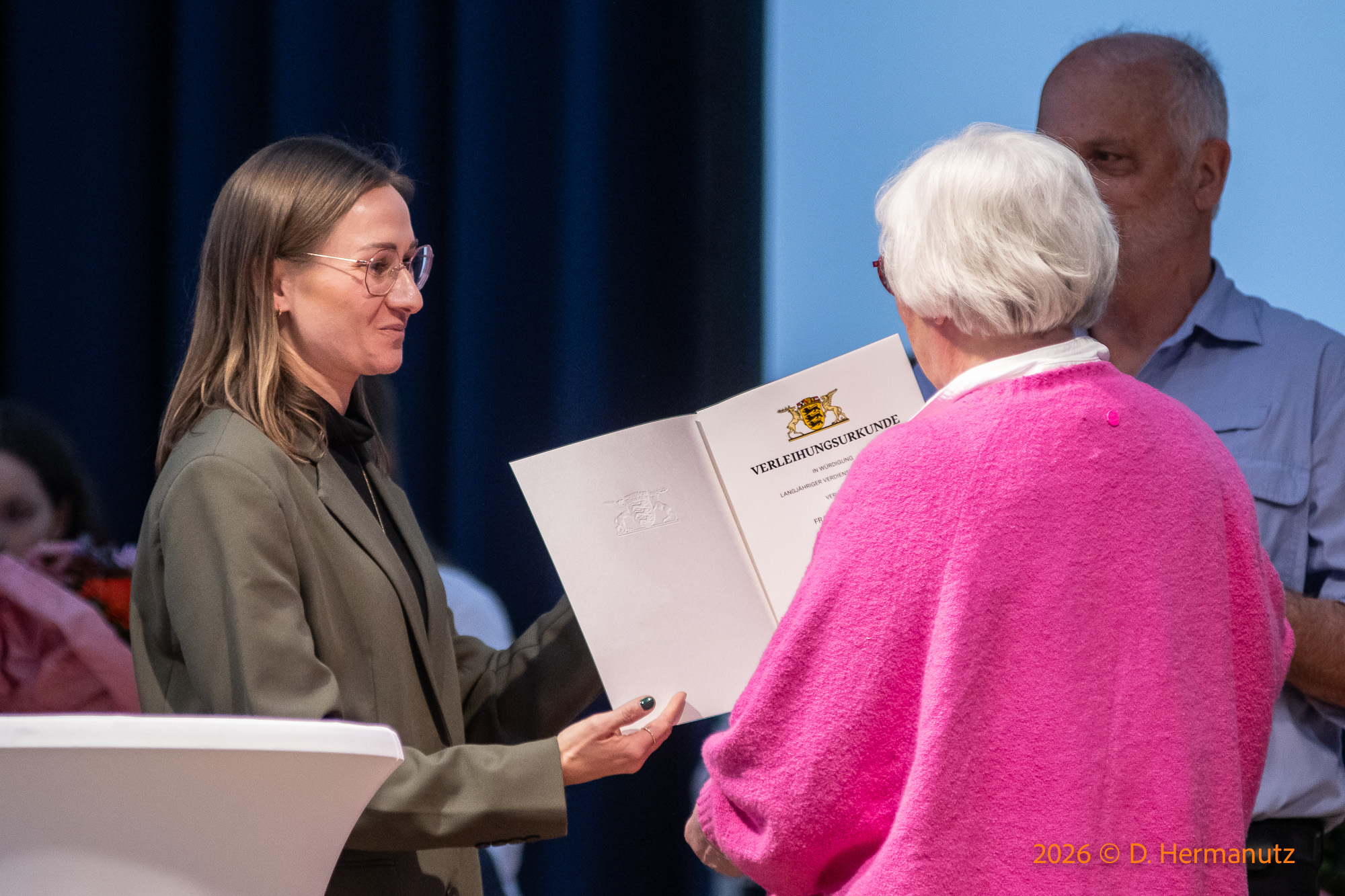 Offenbar hat die Kunde über Ihr vorbildliches, herausragendes Engagement weitere Kreise gezogen und ist auch in Stuttgart vernommen worden. Denn im Auftrag von Herrn Ministerpräsident Kretschmann dürfen wir Ihnen heute die Landesehrennadel verleihen.