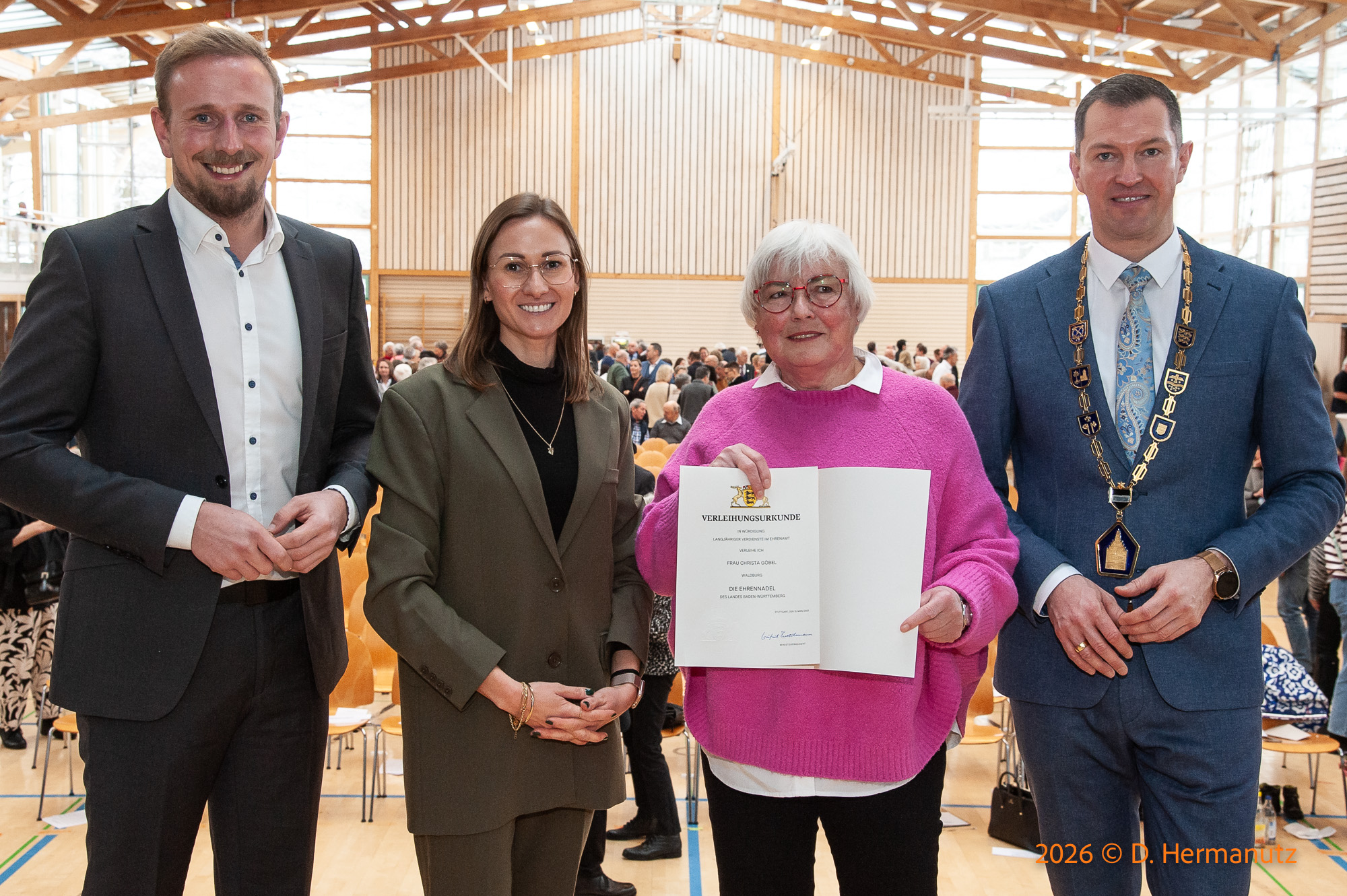 Beim diesjährigen Neujahrsempfang der Stadt Bad Waldsee am 11.01.2026 hat Oberbürgermeister Matthias Henne ehrenamtlich herausragend engagierten Mitbürgern der Stadt geehrt. Besonders herausragend ist unsere Vorsitzende die anlässlich dieses Anlasses mit Ehrennadel des Landes Baden-Württemberg geehrt wurde..